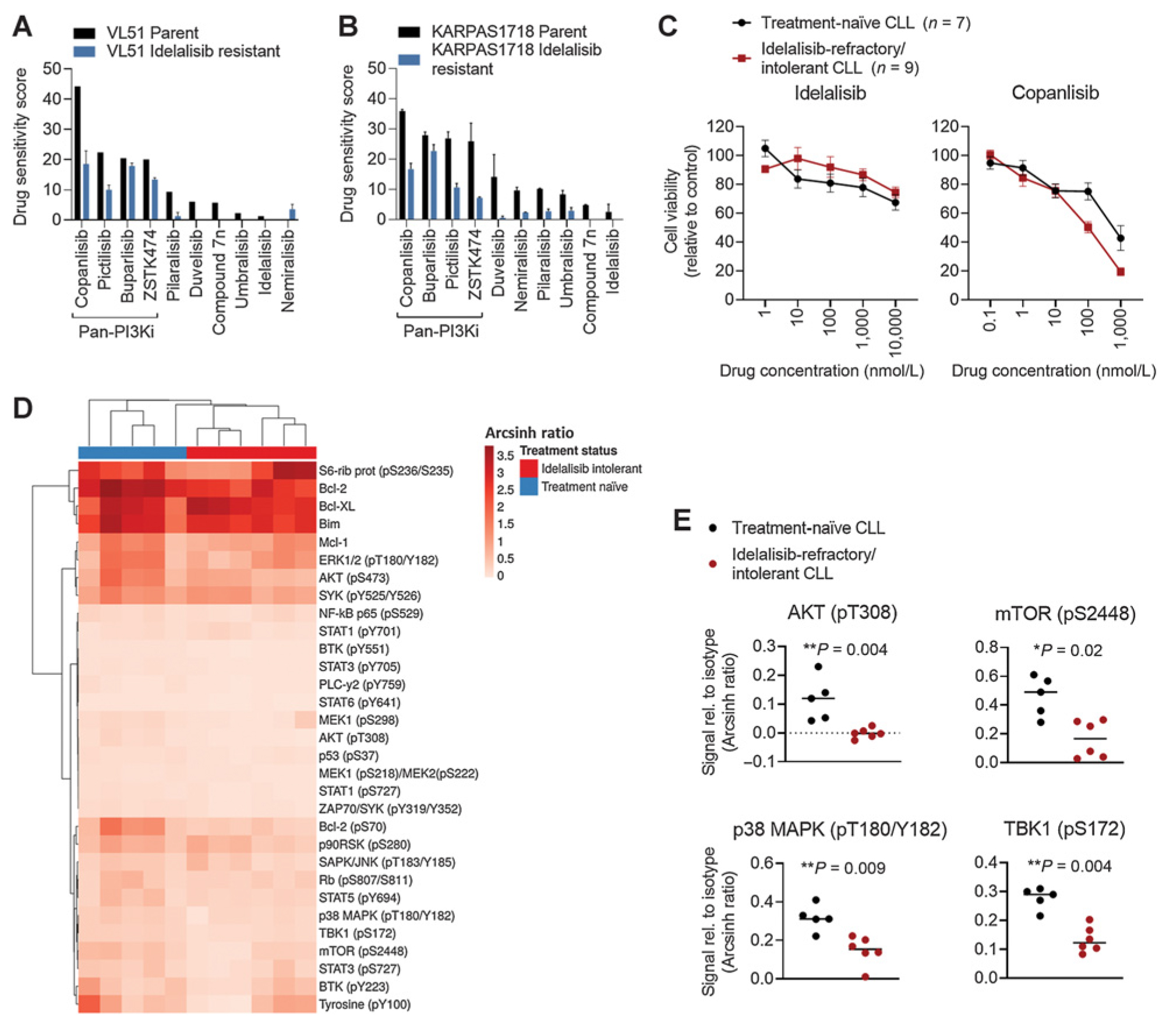 图3. 泛PI3K抑制剂在idelalisib耐药/不耐受的CLL细胞中保持活性
