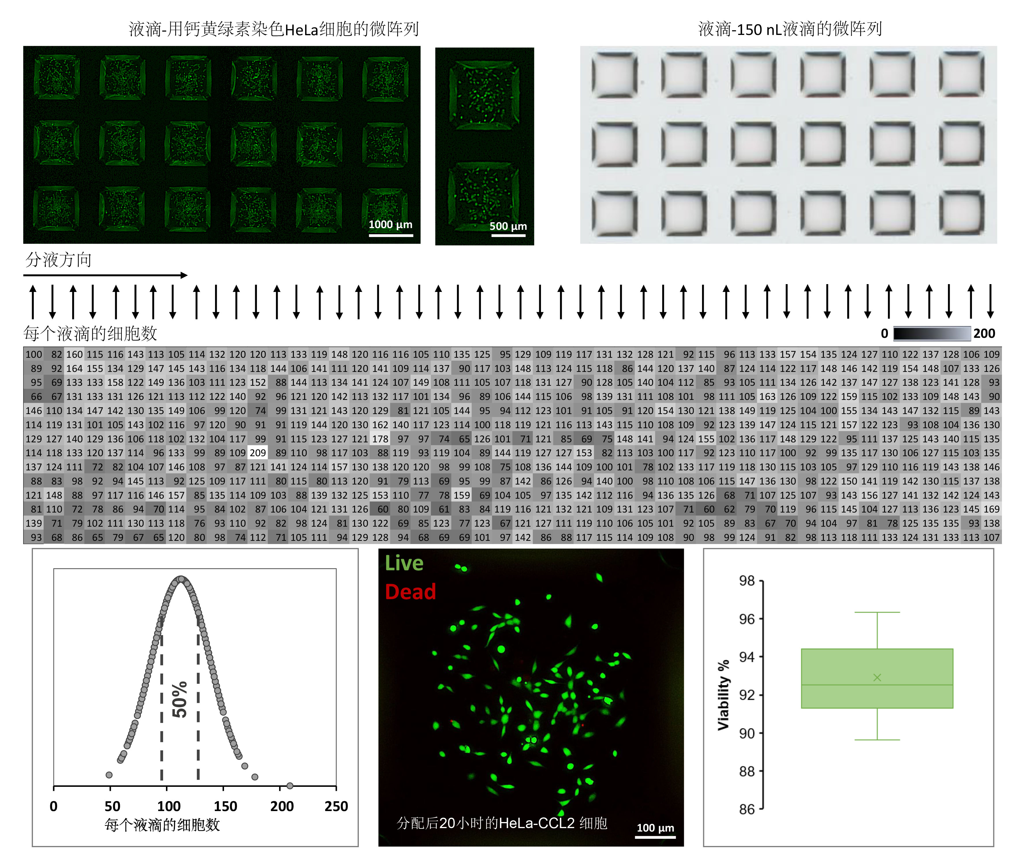 通过显微镜对细胞分布进行计数与形态学分析,结果显示细胞在载玻片上分布均匀,绝大多数微滴内的细胞数量处于80–160个的理想区间内。培养20小时后,细胞存活率高达93±4%,其形态与常规培养条件相比未见明显差异。