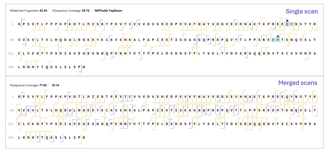 - 与Bottom-Up 搜库整合,提升蛋白质序列覆盖度和翻译后修饰(PTM)定位准确度。