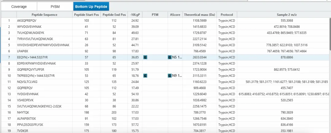 - 将Bottom-Up分析的Peptide Table 整合至 Proteoform Tab 中,用于结果验证。