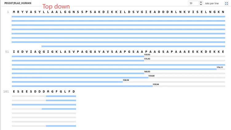 通过整合Top-down与Bottom-up数据,实现对proteoform的全面解析,结合广谱筛选与精准分子结构解析,从而完成序列验证和翻译后修饰(PTM)分析。