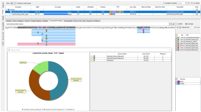 在3.5新版本中,Glycan Profiling功能对抗体重链和/或轻链中鉴定的N-和O-linked位点进行深入的聚糖分析。除了糖肽映射到组装的抗体序列之外,基于不同酶解产物分类的聚糖谱分析显示了在选定的糖基化位点上每个聚糖的组成和相对丰度。并基于与N -linked和O-linked糖库匹配的聚糖片段离子,在每个糖肽谱中提供了聚糖组成和结构的注释信息,和精确的糖基化位点信息。