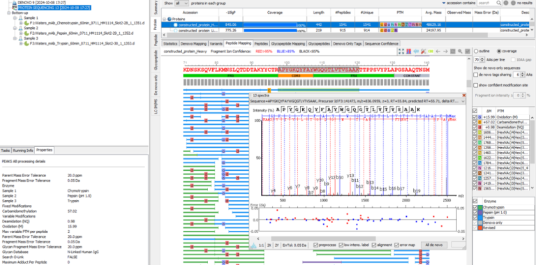 PEAKS® AB是一款利用正交酶解方法,通过液相质谱联用产生的数据进行自动化蛋白水平从头测序的软件。通过de Brujin图论的方法将可靠的多肽从头测序片段组装为完整的蛋白序列。