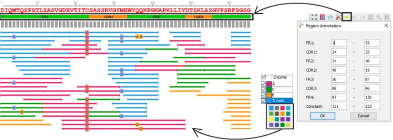 PEAKS® AB 3.5现在为每个PSM应用一个局部置信度(CAA)分数,序列拼接的过程多肽的选择提供更可靠的确证,用户也可以在结果中手动选择代表性peptide。另外,在PTM功能模块中也可以进行抗体序列CDR功能区注释的设置和修改。
