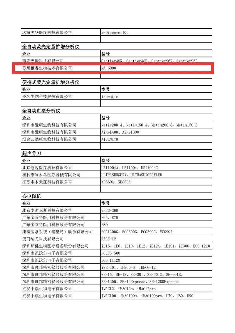 2020年9月8日,中国医学装备协会公示优秀国产医疗设备产品(第六批)遴选结果,雅睿生物MA-6000实时荧光定量PCR仪成功入选,这也是优秀国产医疗设备产品关于PCR类产品的首次遴选。