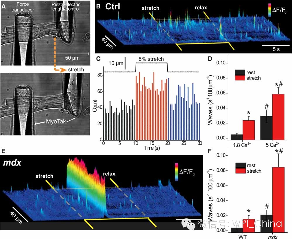 上图为WPI单细胞张力测量仪在正常的和营养不良的心肌细胞研究中的应用,发现营养不良的心肌细胞与钙火花的异常释放有关,该文章(X-ROS Signaling: Rapid Mechano-Chemo Transduction in Heart)由Benjamin L发表于Science 333, 1440 (2011);