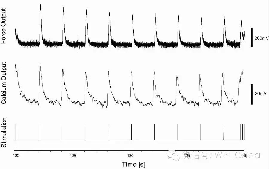 上图为大鼠心脏乳头肌用Fluo-4灌注20分钟刺激反应结果。资料来源于University of Miami.