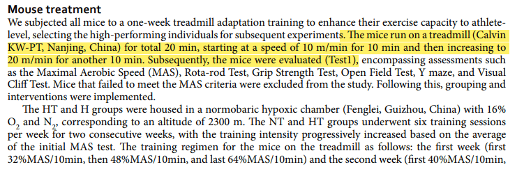 - MAS测试:8cm/s热身5min,之后每1min提速1m/min至力竭(小鼠在跑步机电网停留2秒或累计100次电击),记录最大有氧速度。