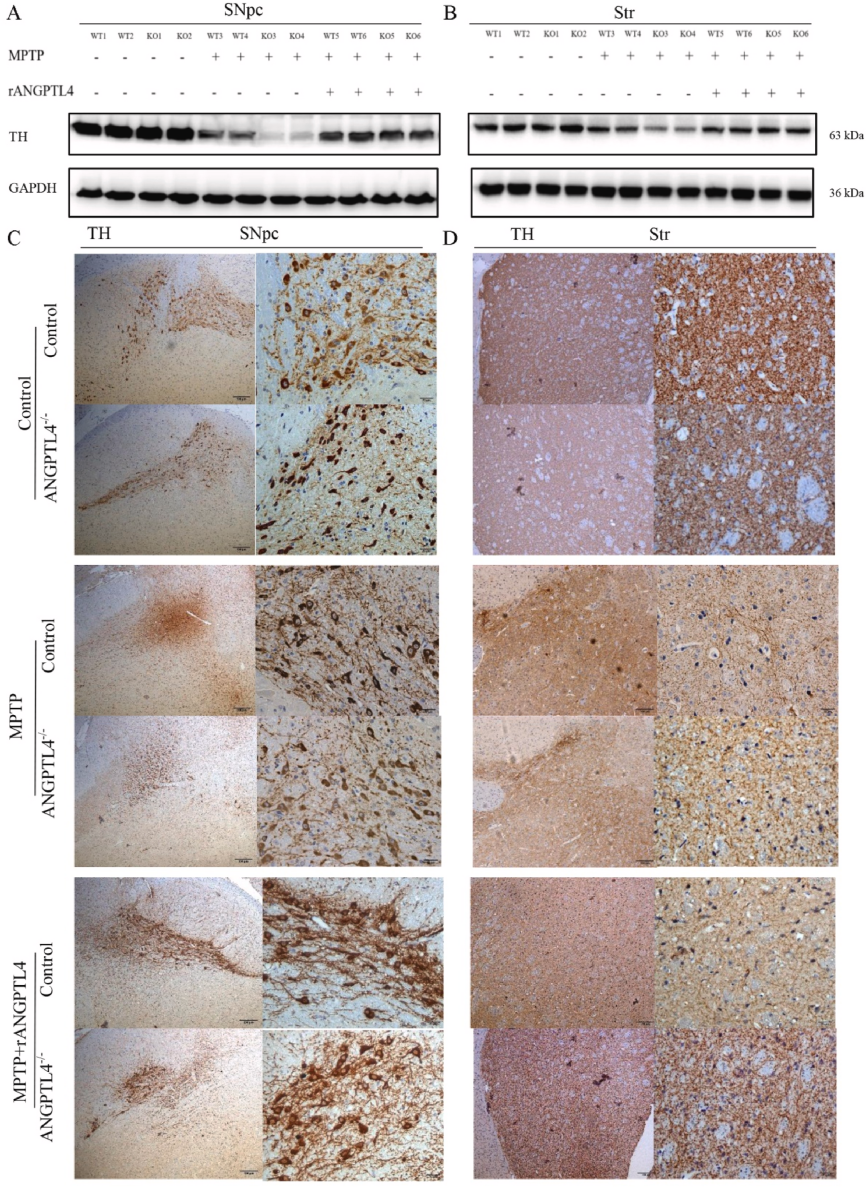 图 4. ANGPTL4 deficiency promotes TH loss while rANGPTL4 reversed the reduction of TH in PD model mice[14].