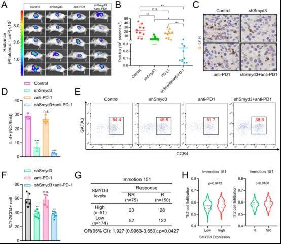 图1 SMYD3的敲低可减少Th2细胞浸润并增强抗PD-1作用