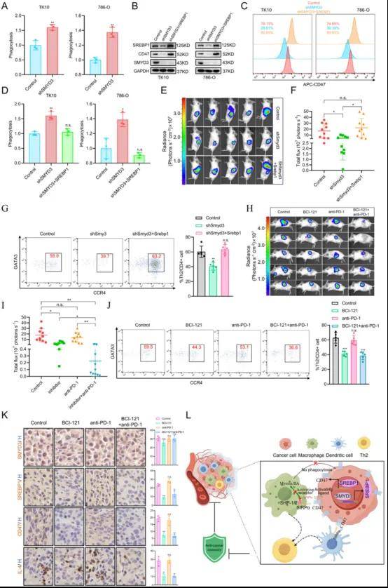 SREBP1是SMYD3的下游转录因子,能调节CD47表达,CD47是癌症细胞表面表达的抑制性检查点靶点,也是先天免疫系统中巨噬细胞的重要抗吞噬调节因子。因此作者试图探索SMYD3在保护肿瘤细胞免受免疫系统清除中的作用,发现SMYD3敲低显著增加TK10和786-O细胞的吞噬作用。为了确定SMYD3是否通过SREBP1的表达激活和CD47上调来驱动肿瘤免疫逃逸,作者在SMYD3敲低的786-O和TK10细胞中过表达SREBP1,发现SREBP1的过表达消除了SMYD3敲除引起的吞噬细胞对肿瘤细胞的清除,且当SREBP1过表达时,细胞的致瘤性增加、Th2细胞的浸润模式与致瘤性相似。