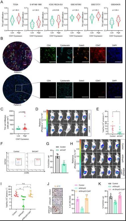 鉴于CD47是SMYD3的下游效应分子,参与协调ccRCC中的抑制性免疫微环境,作者探讨了ccRCC中CD47的表达与Th2细胞之间的相关性。发现CD47表达与Th2细胞的基因集呈正相关。免疫荧光检测结果也证实高CD47表达水平与Th2细胞浸润呈正相关。接下来作者探讨了CD47对肿瘤生长和Th2细胞浸润的影响,发现在原位同基因小鼠模型中敲除Cd47会损害肿瘤生长,在敲除Cd47的RENCA肿瘤中也观察到Th2细胞浸润较少。为了进一步探讨SMYD3是否通过CD47促进ccRCC中Th2细胞的浸润,作者在SMYD3敲低的RENCA细胞中过表达Cd47,发现Cd47的表达有效地逆转了Smyd3敲低介导的肿瘤生长抑制,消除了Smyd3敲低诱导的IL-4蛋白水平降低和Th2细胞浸润减少。