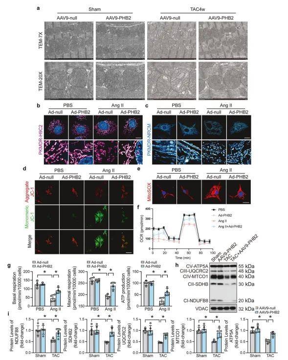 心肌肥大通常伴随着氧化应激的增加,作者发现PHB2过表达对心肌肥大期间的氧化应激具有保护作用。进一步使用TEM评估PHB2过表达对心脏线粒体超微结构的影响,发现上调PHB2通过防止线粒体嵴损伤来保护线粒体的完整性和功能。JC-1染色表明,PHB2过表达通过保持线粒体膜电位来减弱Ang II诱导的JC-1单体形成。此外,PHB2过表达显著减轻了Ang II诱导的线粒体ROS积累。线粒体能量产生与线粒体嵴密切相关,与Ang II治疗的对照组相比,PHB2过表达后线粒体功能增强,基础和最大呼吸能力以及ATP生成显著增加。此外,免疫印迹分析表明,PHB2过表达增加了Ang II处理样本中关键呼吸链成分(复合物I-V)的水平。