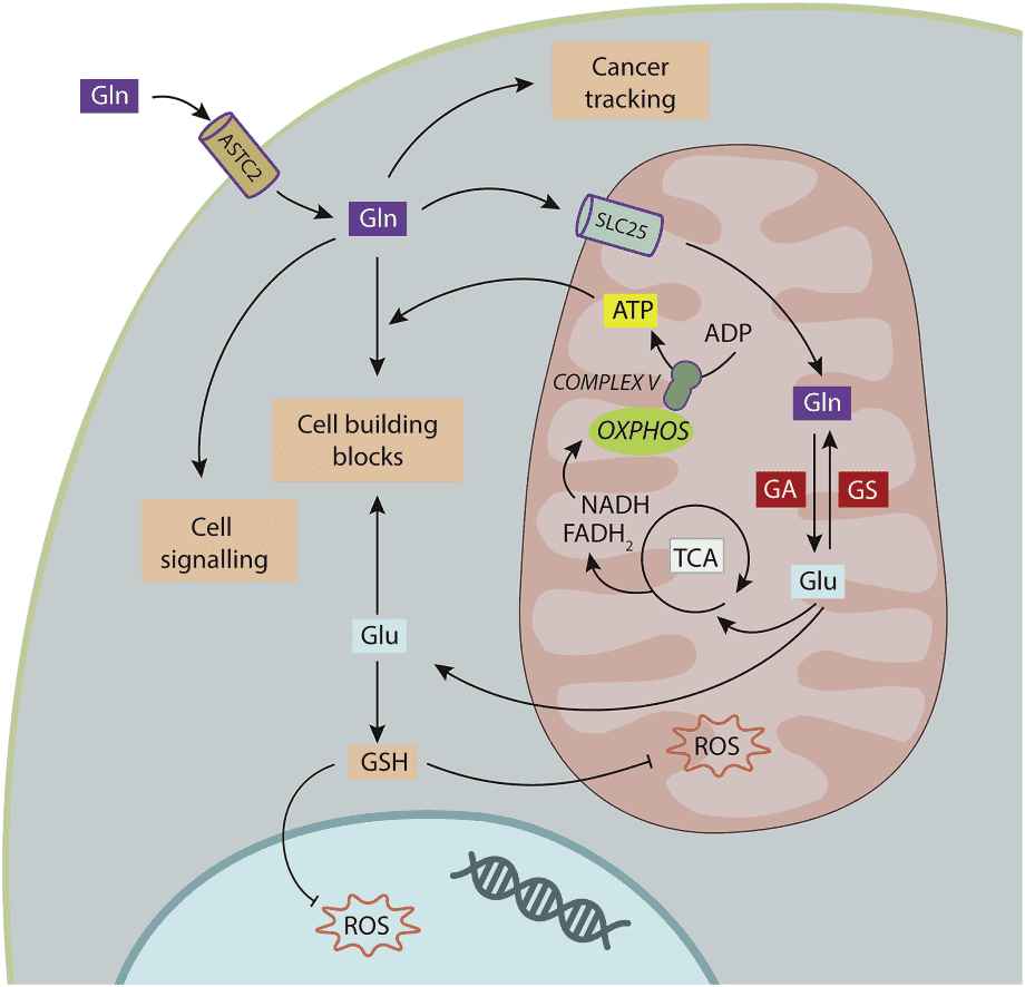 图 1. Glutamine (Gln) as a pleiotropic molecule in cancer