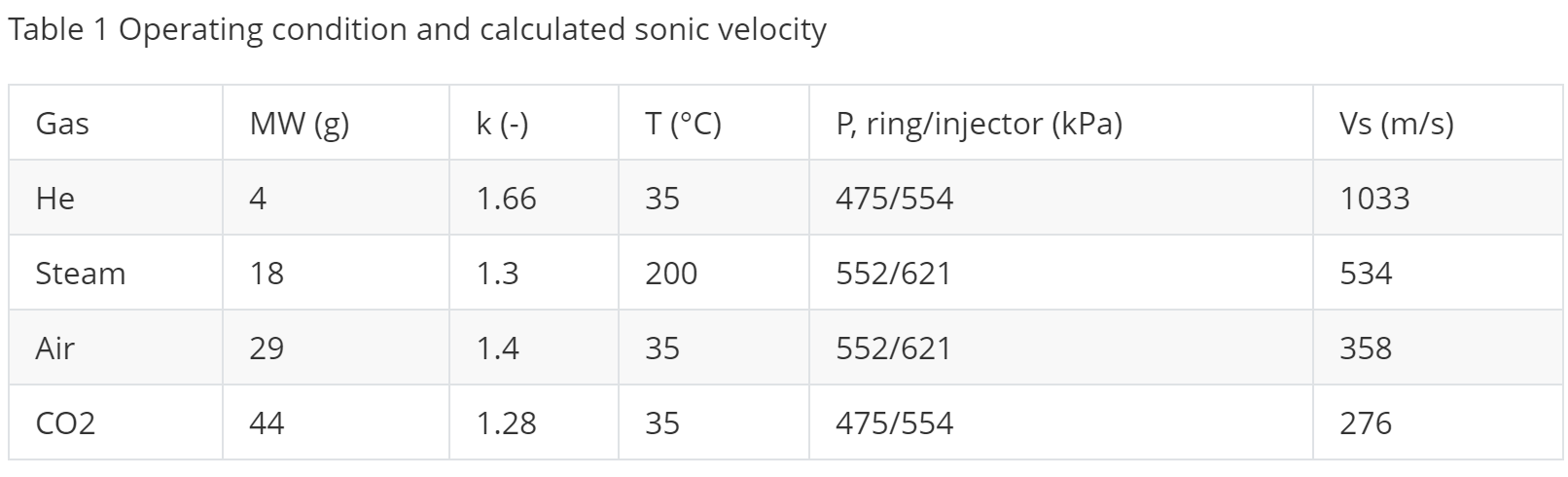 在温度较高的条件下,分子量更小的气体能产生更高的声速,进而具有更高的动能。而气体速度及其产生的动能,是决定粉碎性能的关键因素。本实验通过选取不同分子量的气体,以扩大气体速度的研究范围,所选气体包括氦气、蒸汽、空气和二氧化碳,其分子量范围为 4-44 g/mol 。其中,过热蒸汽的温度控制在 200℃,其余三种气体均处于环境温度(35℃)下。实际操作条件及根据公式计算得出的相应声速如表 1 所示。