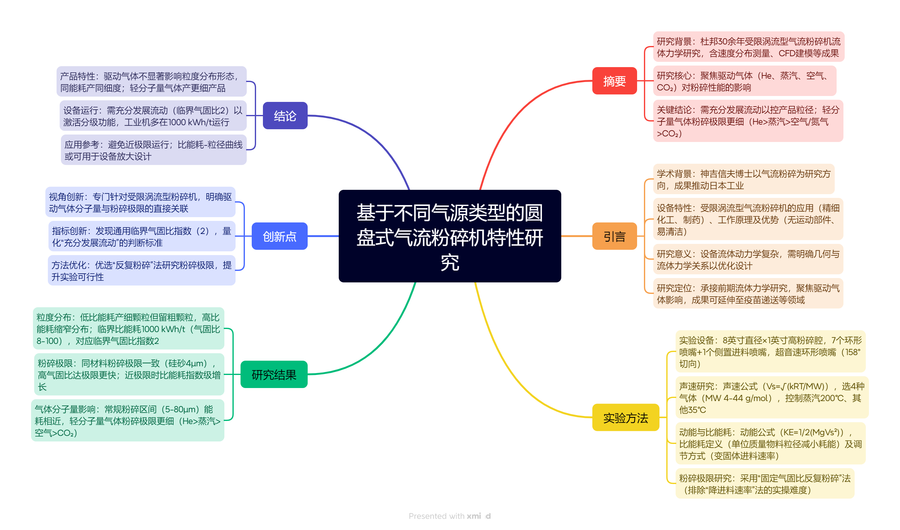 结论研究结果表明,形成了一个稳定、高速、对称的旋转气流结构所需的临界气固比约为 2,即每 1 kg/h的固体进料需搭配2kg/h的气体流量,该气固比对应的比能耗水平约为 1000kWh/t;