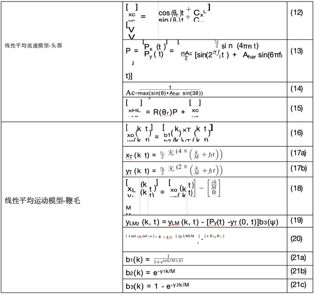 当其向前推进时,这一特征会导致围绕直线的带状运动。用于模拟线性均速游动细胞头部和鞭毛运动的方程列于表2中。