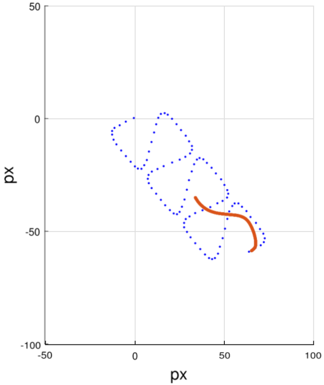 图15.线性平均游动细胞精子鞭毛生成示例。(橙色)模拟鞭毛。(蓝色)线性平均游动细胞 轨迹。