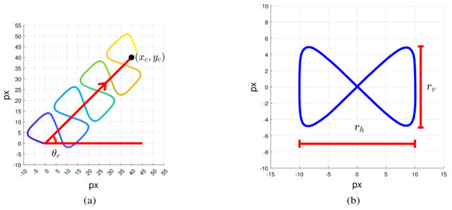 沿正向运动的位移量 θ r(公式12) 。沿“带状”路径(P x (t) P y (t))的位置由公式(13-14)生成。该带 状结构如图14b所示,其中r v表示带高,r h为宽度。P x(t)和P y (t)是t 的周期性函数。Px(t)是一个频率为2f
