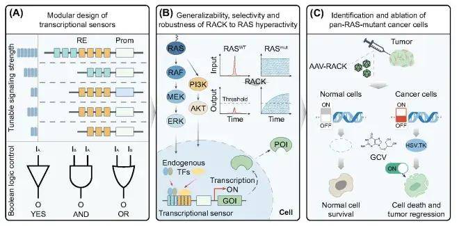 本研究开发的RAS激活的癌症杀伤系统RACK基于合成回路,为癌细胞识别和消融提供了一种新的方法。在该系统中,通过工程化的转录传感器检测特定的致癌信号,从而驱动治疗反应的激活,RACK系统将为癌症治疗提供可行的策略。