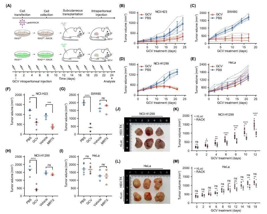 为了开发用于根除癌症细胞的RACK系统,将HSV-TK基因直接定位在合成转录传感器的下游,导致HSV-TK酶在RASmut细胞中特异性表达增强,随后将前药GCV转化为细胞毒性产物。研究人员首先在人类细胞系中验证了携带不同启动子的RACK构建体的功效,发现两种RACK构建体在给予GCV后均能有效诱导过表达KRASG12C的HEK293T细胞死亡,而PA1S2驱动的RACK系统清除癌细胞的效果优于PAP1驱动的系统。为证实RACK在KRASmut癌症细胞中的抗癌特异性,使用RACK转染过表达KRAS的HEK293T细胞,并证明RACK促进了KRASG12C过表达的HEK293T细胞的特异性消融,过表达KRASWT的HEK293T细胞不受治疗的影响。采用癌症共培养模型来评估RACK的高选择性抗癌活性,在该模型中,用RACK(lenti-PA1S2-HSV-TK-pA)处理包含NCI-H23EGFP和HeLamTagBFP2细胞的共培养物。正如预期的那样,RACK选择性地杀死了KRASG12C NCI-H23细胞,但保留了KRASWT HeLa细胞,进一步证实了RACK对KRAS活跃细胞的特异性。