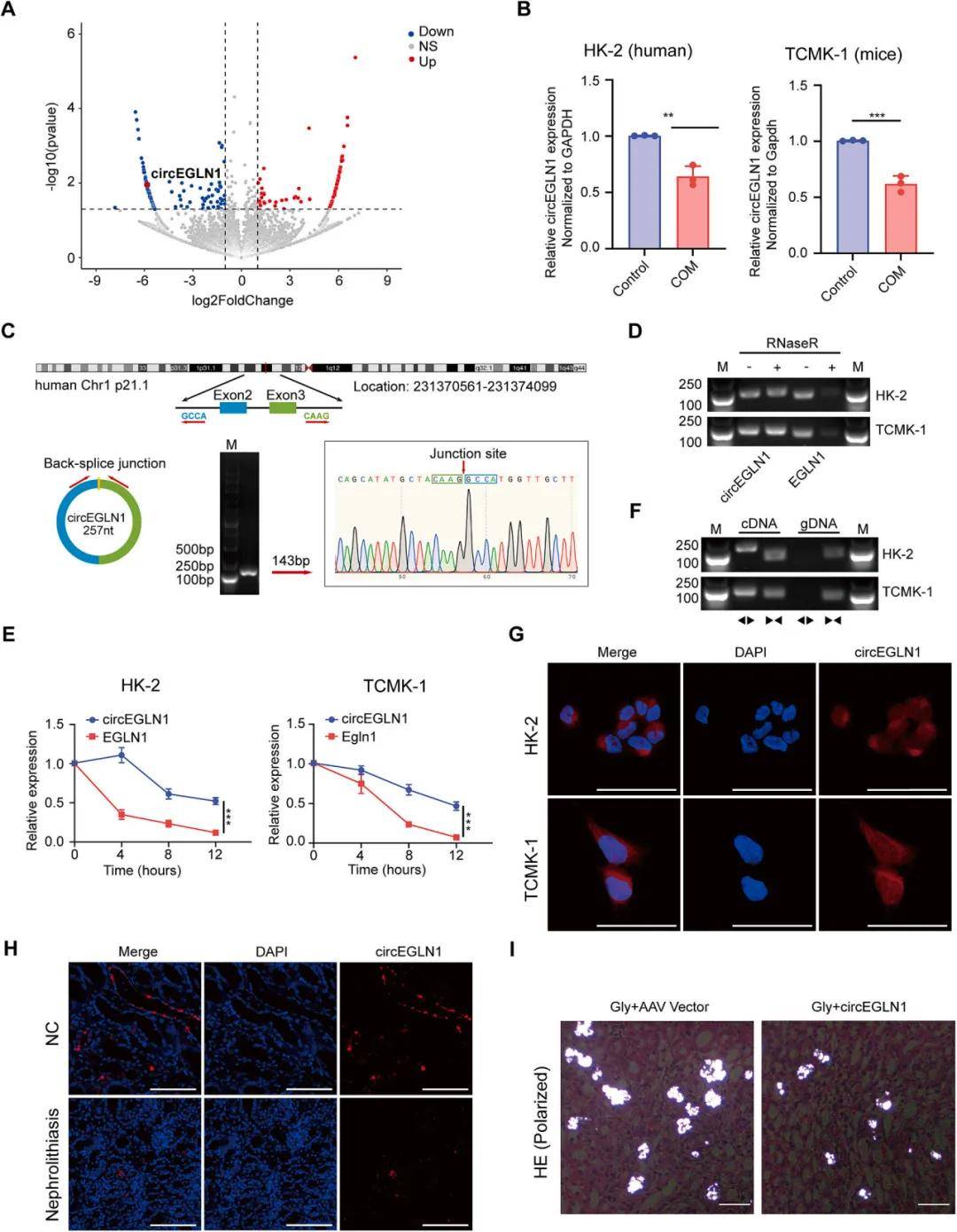 通过对COM诱导的HK-2细胞进行核糖体RNA去除的circRNA测序及分析,发现circEGLN1显著下调。该circRNA在人与鼠中序列高度保守(93.4%),均由EGLN1的2-3号外显子反向剪接形成,具有高稳定性和长半衰期;亚细胞分离实验证实其主要定位于细胞质。临床RNA FISH显示肾结石患者肾组织中circEGLN1表达较低;在乙醛酸诱导的肾结石小鼠模型中,AAV介导的circEGLN1过表达显著减少肾CaOx晶体沉积,提示其预防潜力。
