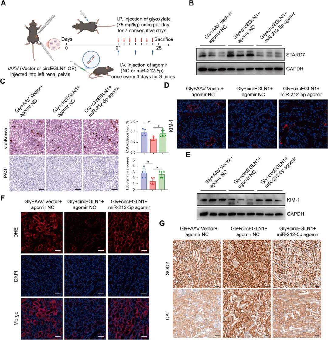 最后,研究团队在乙醛酸诱导的CaOx肾结石小鼠模型中设立三组实验:对照组(rAAV空载体)、circEGLN1过表达组(rAAV-OE-circEGLN1)和circEGLN1过表达+miR-212-5p激动剂组。结果显示,circEGLN1过表达显著提高肾组织中STARD7的mRNA和蛋白水平,而miR-212-5p激动剂完全逆转这一效应,证实circEGLN1通过吸附miR-212-5p解除其对STARD7的抑制。Von Kossa染色显示circEGLN1过表达组CaOx晶体沉积减少,miR-212-5p激动剂恢复沉积;PAS染色和KIM-1检测表明circEGLN1改善肾小管损伤,miR-212-5p抵消此保护作用。此外,circEGLN1过表达降低肾组织ROS和MDA水平,同时提升CAT、SOD、GSH活性,而miR-212-5p激动剂拮抗这些效应。综上,circEGLN1通过吸附miR-212-5p上调STARD7表达,进而减轻CaOx诱导的肾氧化损伤和晶体沉积。