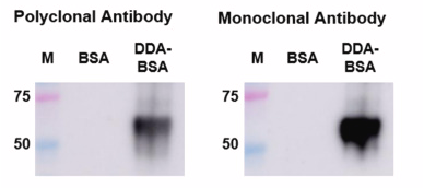 多克隆抗体制备过程中的核心挑战在于批次间差异性,其根源在于免疫动物的个体生物学差异,包括遗传背景、免疫状态及健康状况等因素。尽管通过标准化生产流程可在一定程度上降低工艺带来的相关变异,但无法完全消除生物体固有差异所导致的质量波动。因此,从多克隆抗体库中筛选获得高特异性、高灵敏度的单克隆抗体具有重要的产业转化价值。如图所示,在Western blot分析中,多克隆抗体与DDA-BSA结合物反应呈现多个条带,证实其多表位识别特性;而单克隆抗体仅显示单一显著条带,体现了其高度特异性[4]。
