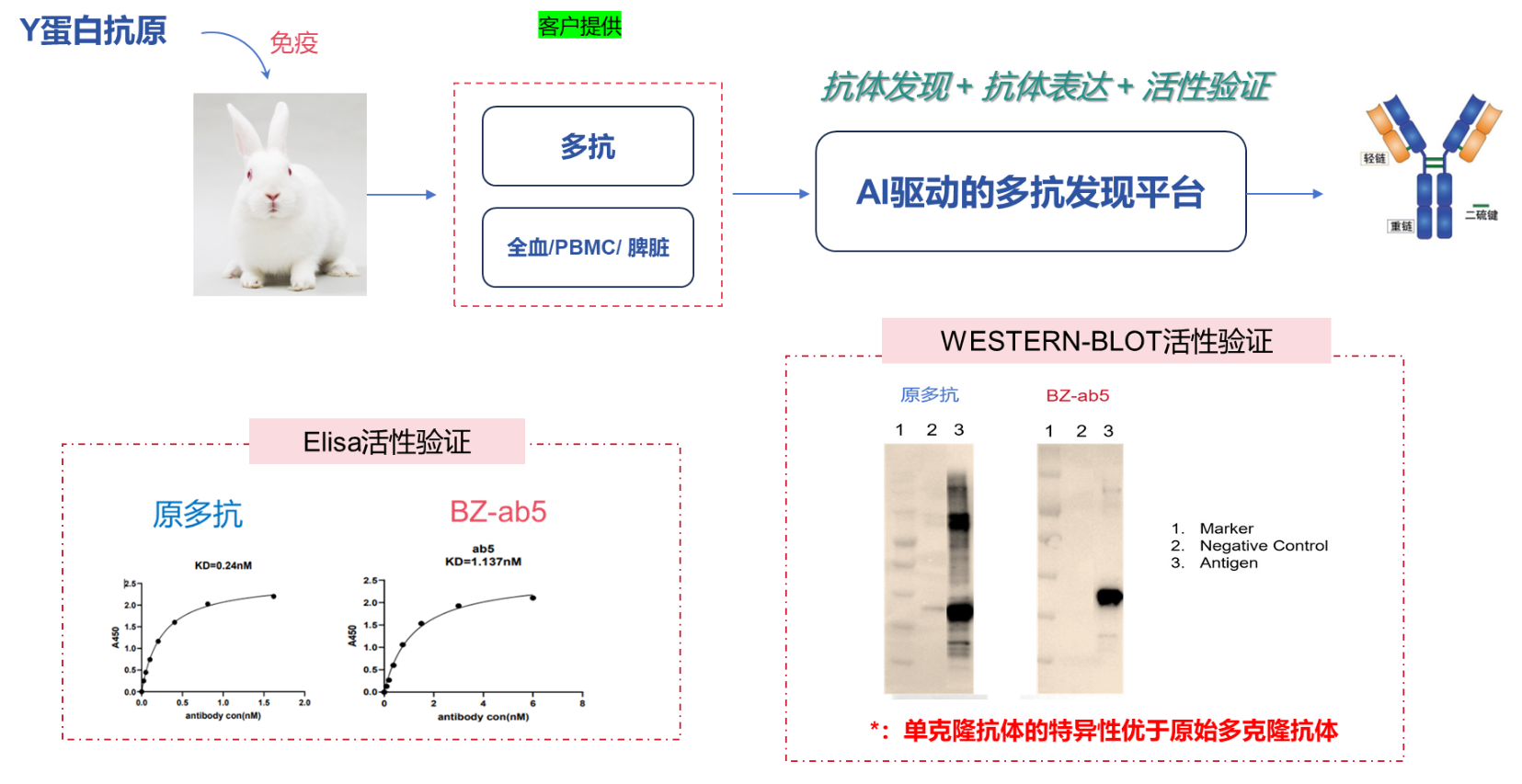 Y蛋白作为抗原免疫新西兰大白兔后,获得高特异性多克隆抗体,同时获取全血PBMC测序获得BCR序列模版。使用我司AI驱动多抗发现平台提供的抗体发现和活性验证全流程服务后,获得3个高活性的单克隆抗体。ELISA实验验证其中ab5具有与原多抗相似的亲和力,WESTERN-BLOT实验确证该单克隆抗体特异性明显优于原始多克隆抗体。