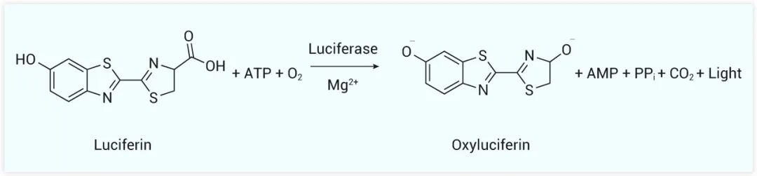 荧光素酶以荧光素、三磷酸腺苷 (ATP) 和 O2 为底物,在 Mg2+ 存在时,可将化学能转化为光能。在荧光素酶催化的发光反应中,ATP 在一定的浓度范围内,其浓度与发光强度呈线性关系。此方法不受化合物自发荧光的影响。