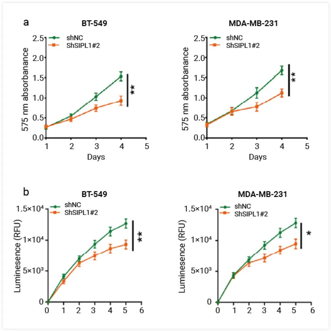 - ATP 发光细胞活力测定:TNBC 细胞在 37°C 下培养过夜。然后,将 100 μL ATP 发光法活力检测试剂直接与培养基混合,在室温下培养 20 分钟。结果显示,转染靶向 SIPL1 shRNAs 的 BT-549 和 MDA-MB-231 细胞系的细胞增殖显著降低 (图 3)。