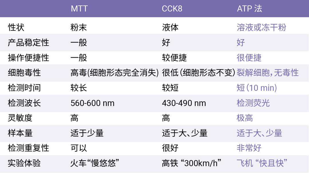 表 1. MTT、CCK8 与 ATP 法特点比较