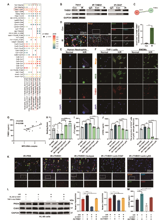 作者发现心脏移植患者术后血清中MPO-DNA复合物(NETs标志物)水平显著上升,中性粒细胞更容易被诱导产生NETs,并且NETosis与HT患者心肌IR损伤的发生密切相关;利用小鼠颈部异位心脏移植模型和心肌细胞缺氧复氧(H/R)模型在体内外探究了HT再灌注损伤的病理生理学,发现NETs是心脏移植后心肌IR损伤的关键介质,靶向NETs形成是潜在治疗方向。为明确产生NETs的中性粒细胞类型,研究团队对移植心脏的非心肌细胞进行了scRNA-seq分析,DEGs分析确定了9个细胞亚群,并发现Ero1l+中性粒细胞亚群NETs评分最高,定义为“NETs相关中性粒细胞”,与HT后心肌IR损伤诱导的NETs密切相关。进一步的研究表明HT后心肌IR损伤过程中Ero1l+中性粒细胞NETs的形成与M1巨噬细胞密切相关。作者分析了巨噬细胞驱动的配体-受体对,发现THBS1-CD47的差异在M1巨噬细胞亚群和Ero1l+中性粒细胞之间很明显。免疫共沉淀实验证表明,与对照组相比,IR组中THBS1和CD47之间的相互作用显著增加。M1巨噬细胞是HT后THBS1分泌的来源之一,巨噬细胞可以通过产生THBS1介质来诱导中性粒细胞CD47激活和NETs表型,加剧IR损伤。