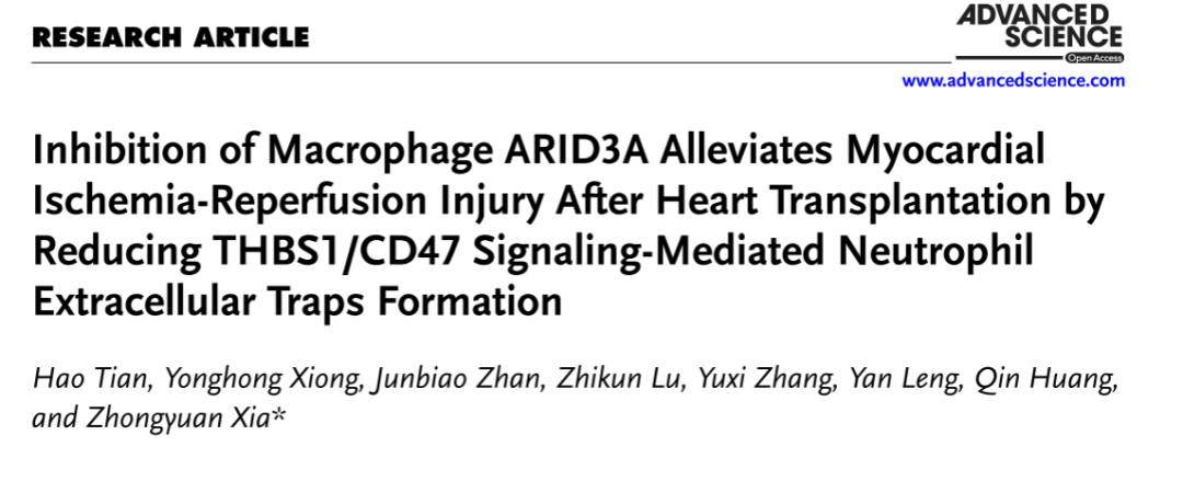 武汉大学人民医院夏中元教授团队在Advanced Science(IF 14.1)上发表了题为“Inhibition of Macrophage ARID3A Alleviates Myocardial Ischemia-Reperfusion Injury After Heart Transplantation by Reducing THBS1/CD47 Signaling-Mediated Neutrophil Extracellular Traps Formation”的研究论文,结果表明THBS1/CD47信号通路是介导M1型巨噬细胞与NETs相关中性粒细胞之间相互作用的关键桥梁,4-辛基衣康酸酯(4-OI)有望成为治疗心脏移植后心肌缺血再灌注损伤的潜在治疗候选药物。