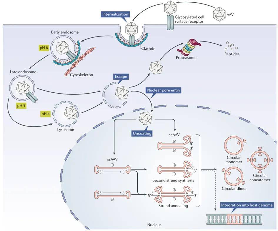 识别和内吞:AAV被宿主的糖基化细胞表面受体识别,并通过网格蛋白介导的内吞作用进入细胞内。