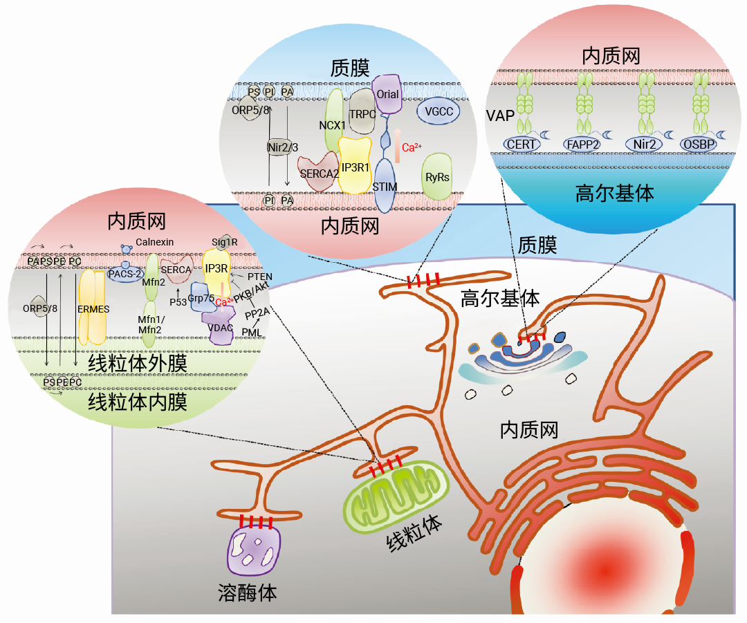 膜接触位点 (Membrane contact sites, MCS):指两个细胞器在不发生膜融合前提下的紧密相互作用区域 (通常在30-50 nm以内,但有时更远)。将细胞器固定在 MCS 处的蛋白质复合物可以插入 MCS 处的细胞器内部,也可以与相对膜上的蛋白质或脂质结合。这些复合物通常被称为系链,除了物理连接之外,它们在这些位点通常还具有其他功能,例如内质网-线粒体接触位点促进 Ca2? 转移、线粒体分裂、细胞内信号传导和脂质代谢。
