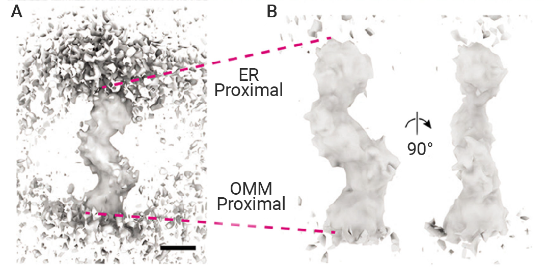 图 2. 内质网-线粒体接触结构(ERMES)介导的 MCS 由连接两个膜的桥状结构组成[3]。