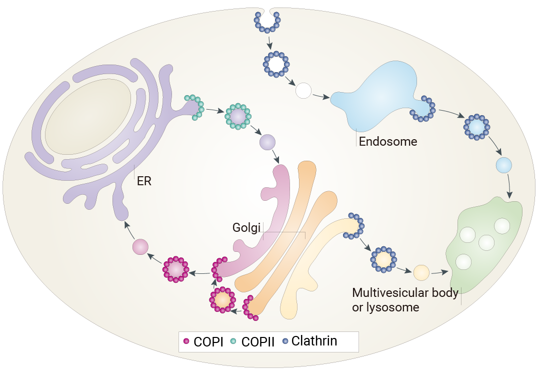 已经较为明确的包膜蛋白所介导的囊泡运输途径。包膜蛋白 ii (cOPii;绿色) 形成用于从内质网 (ER) 向高尔基体进行顺向运输的囊泡;而 cOPi (红色) 则形成用于高尔基体内部运输以及从高尔基体向内质网进行逆向运输的囊泡。壳蛋白 (蓝色) 基于其与不同衔接蛋白 (APs) 的结合而形成多个复合物。与 AP1 和 AP3 结合的壳蛋白形成用于从跨高尔基体网络到后续内吞细胞器运输的囊泡,以及来自早期内吞细胞器的运输;与 AP2 结合的壳蛋白则形成从质膜产生的运输至早期内体的囊泡。