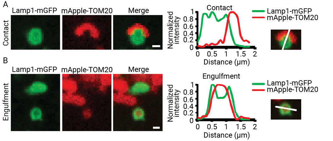 A.溶酶体-线粒体近距离接触;B.溶酶体吞噬线粒体。