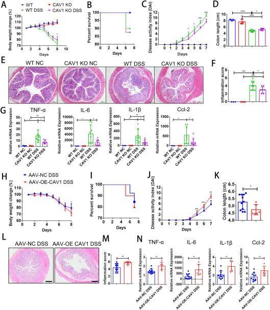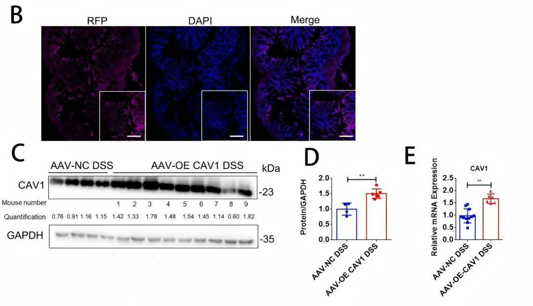 临床IBD患者和DSS治疗小鼠肠道中CAV 1表达均显著增加。与WT小鼠相比,CAV1 KO小鼠经DSS处理后,结肠炎症状有所减轻。接下来,研究团队通过功能获得性实验检测CAV1在IBD中的作用,尾静脉注射RFP标记的过表达CAV1的AAV7病毒。免疫荧光显示,CAV1蛋白在结肠上皮中成功表达,Western blot分析和定量PCR分析均显示,CAV1在结肠中的总表达量显著高于对照组。与AAV-NC DSS处理的小鼠相比,AAV-OE-CAV 1 DSS处理的小鼠的体重减轻、DAI评分和结肠长度缩短明显加重;此外,在CAV1过表达小鼠的结肠中,促炎细胞因子的表达水平显著增加,表明CAV1缺陷减轻DSS诱导的小鼠结肠炎。