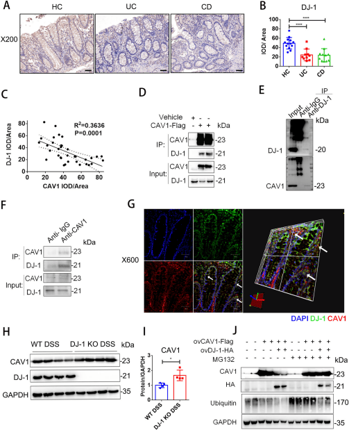 进一步研究CAV1在上皮中的作用,发现CAV1 KO小鼠在DSS诱导下,上皮屏障标志物ZO-1的表达降低程度显著低于WT小鼠,TUNEL染色显示上皮细胞死亡减少。通过检测多种细胞死亡标志物证明,CAV1促进上皮中的坏死性凋亡,从而加剧IBD中上皮屏障的破坏。随后研究人员探索了调控CAV1表达的上游机制,pulldown实验发现DJ-1与CAV1存在相互作用,co-IP证实二者在内外源条件下均能显著结合,且免疫荧光显示UC患者结肠组织中DJ-1与CAV1存在共定位。进一步的实验验证表明DJ-1通过蛋白酶体介导的蛋白降解途径调控CAV1。基于上述结果,研究团队产生了CAV 1和DJ-1双敲除(DKO)小鼠以验证CAV1是否在DJ-1下游的IBD发病机制中起作用,最终结果证实敲除CAV1能逆转DJ-1缺陷对结肠炎的加剧效应。