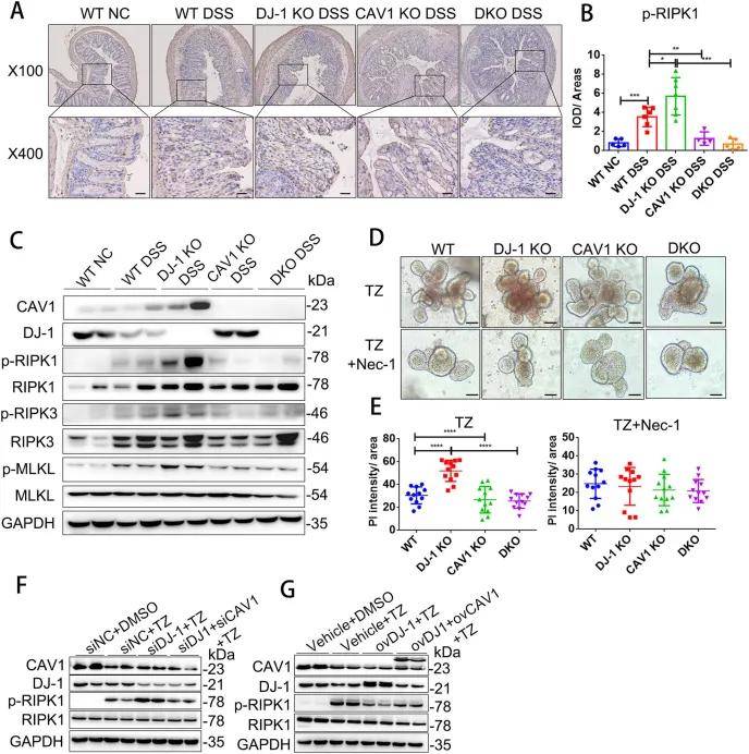 在DSS诱导的结肠炎模型中,DJ-1敲除小鼠结肠组织中坏死性凋亡标志物(p-RIPK1、p-RIPK3、p-MLKL)表达显著高于野生型小鼠,而CAV1与DJ-1 双敲除(DKO)小鼠可显著逆转这一升高趋势,表明坏死性凋亡是DJ-1/CAV1通路的下游效应环节。类器官实验验证中,DJ-1 KO类器官的细胞坏死强度显著高于WT,而CAV1 KO或DKO类器官的细胞坏死强度显著降低;加入坏死性凋亡抑制剂Nec-1后,不同基因型类器官的细胞坏死强度差异消失,证实 DJ-1/CAV1通路通过坏死性凋亡影响上皮细胞状态。体外细胞模型中DJ-1与CAV1的敲除及过表达结果同样验证了这一点。进一步研究显示,药物抑制坏死性凋亡也能减轻DJ-1缺陷和DSS诱导的实验性结肠炎症状。