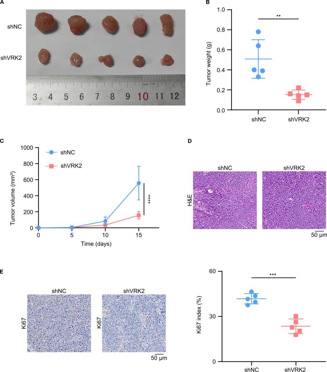 由于VRK2在三个HCC肿瘤组织中高度表达,作者进一步研究了VRK2在HCC中的作用。使用siRNA敲低了VRK2表达,发现VRK2敲低抑制了MHCC97H和HCCLM3细胞的增殖、迁移和侵袭能力。蛋白质印迹结果证实VRK2敲低降低了AKT1和RPS6的磷酸化水平。这些结果表明VRK2敲低抑制了体外HCC增殖和转移,并降低了AKT1和RPS6的磷酸化水平。接下来,作者研究了VRK2敲低对体内HCC的影响。异种移植肿瘤模型证实VRK2敲低抑制体内肿瘤生长,伴随着肿瘤重量和体积的减少,Ki-67染色揭示VRK2敲低降低肿瘤增殖,这些发现表明VRK 2敲低在体外和体内抑制HCC进展。