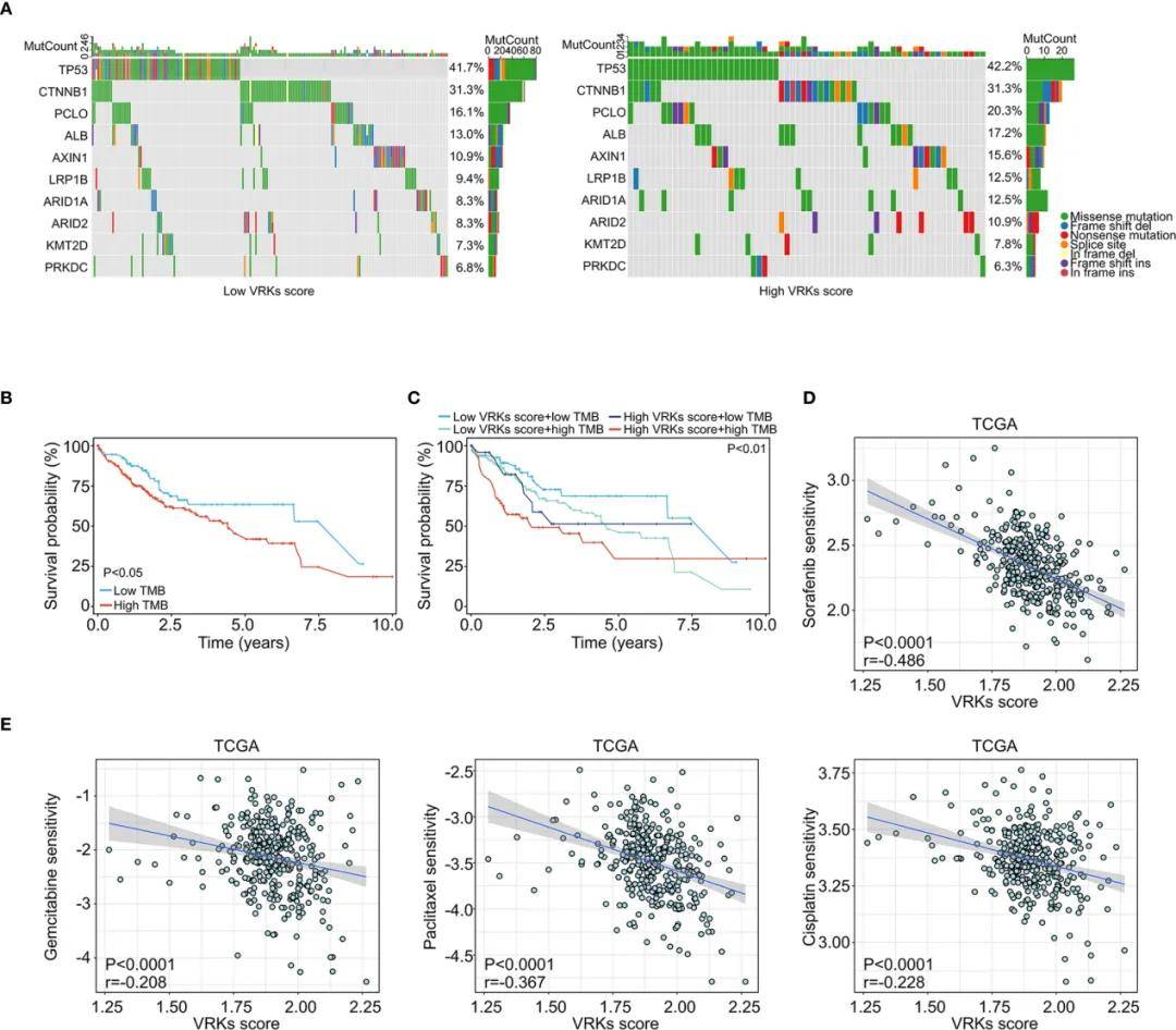 作者发现VRK家族基因在大多数肿瘤组织中呈高表达,且VRK家族基因在肝癌组织中的表达与TNM分期和TP53突变密切相关。然后作者基于单样本基因集富集分析(ssGSEA)算法建立了VRK评分,并发现VRK评分能用于HCC患者预后分析,是HCC患者对免疫检查点阻断反应的潜在预测因子。此外肿瘤突变负荷(TMB)反映了肿瘤的基因突变水平和预后,作者发现高TMB的患者具有较差的总体存活率,高TMB与高VRK评分的组合与HCC患者中最差的结果相关。作者还评估了VRK评分中免疫检查点抑制剂以外的其他治疗药物的敏感性,发现VRK评分低的患者更可能对索拉非尼、吉西他滨、紫杉醇和顺铂敏感。这些发现表明VRK评分可作为HCC患者全身治疗反应的稳健预测生物标志物。