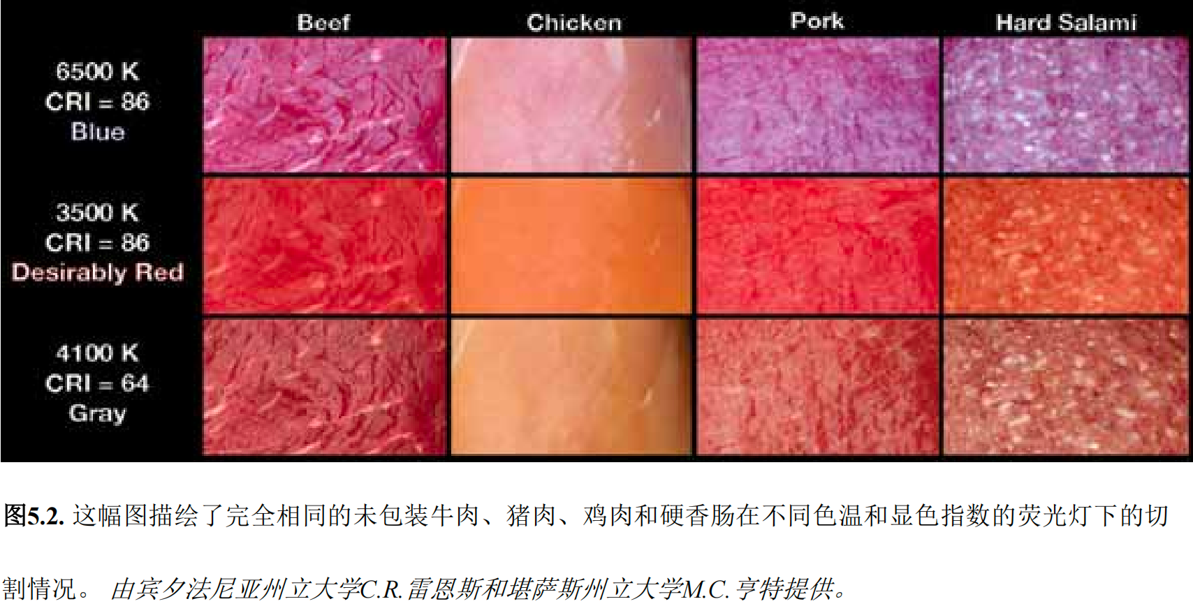 肉类展示柜可选用荧光灯、卤素灯、高强度气体放电灯、白炽灯及发光二极管(LED)等光源。美国目前主流仍为荧光灯,但LED灯正逐渐普及且预计会更广泛使用。鉴于荧光灯泡的普及性和广泛可用性,肉类研究人员需注意并非所有荧光灯泡都相同或可互换。不同类型 灯泡具有独特特性,直接影响肉品色泽及色泽稳定性(图5.1和5 . 2)。 正确选择肉类研究用灯泡 并如实记录光源信息至关重要。通常而言,肉类展示研究中使用的照明设备应具备以下特征: