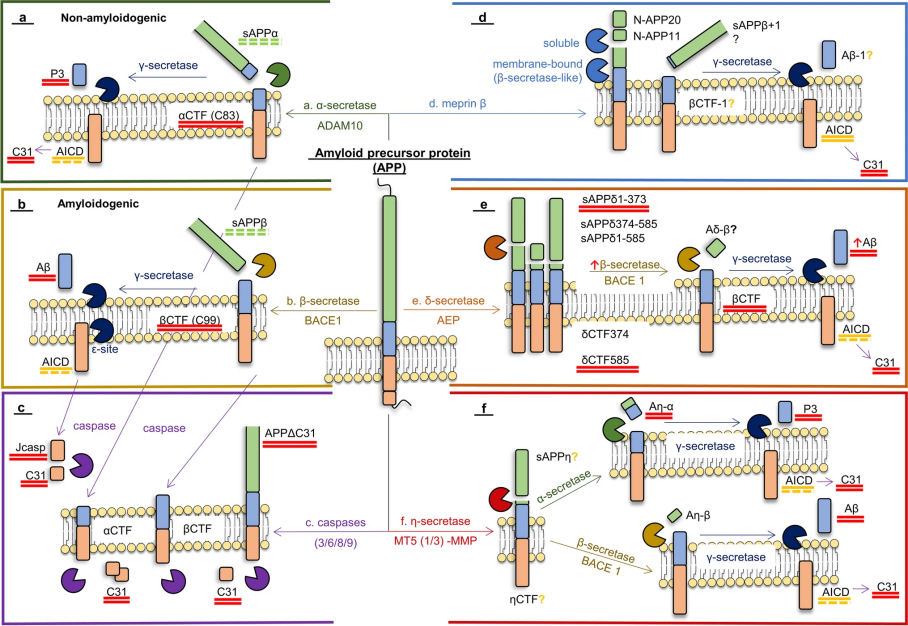 α分泌酶活性的上调可以促进APP 以非淀粉样蛋白的形式切割,以此减少 Aβ蛋白的形成并增加可溶性结构域(sAPPα)的产生。