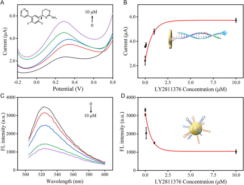 LY2811376 (AbMole,M2172)作为一种已知的高效 BACE1 抑制剂,在该研究中作为阳性对照,用于验证上述传感器对BACE1活性的检测能力:通过检测不同浓度的LY2811376 处理后检测传感器的信号变化,证明该传感器可检测到BACE1的蛋白酶活性变化