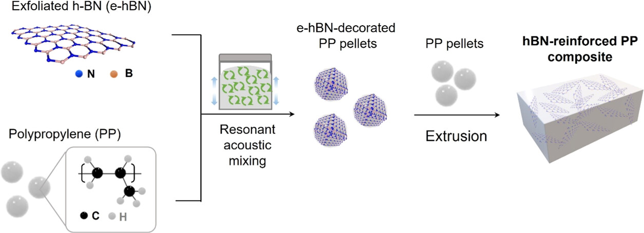 图 3.e-hBN 增强 PP 复合材料的制备。(a) 使用共振声学混合器用 e-hBN 纳米片涂覆 PP 颗粒,(b) 将 e-hBN 涂层的 PP 颗粒熔融挤出到复合片材中。