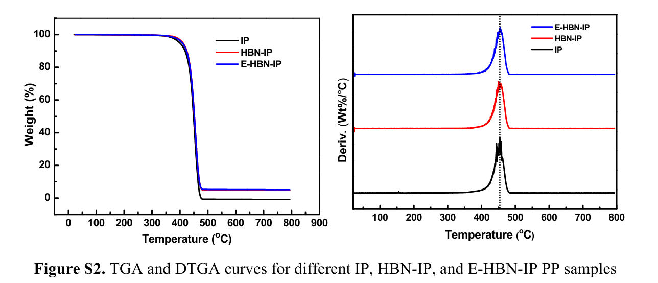 e-hBN 样品表现出较小的重量损失,这归因于残留的聚(4-乙烯基吡啶)(P4VP),在 e-hBN 制备过程中用作分散剂。然而,尽管 h-BN 具有较高的热稳定性,但添加 h-BN 后 PP 的热分解没有明显改善,如图 5b,c 所示。纯 HP、h-BN-HP 和 e-hBN-HP 样品的分解温度约为 450 °C,降解速率相似。在 h-BN-IP 样品中观察到类似的趋势,因此图 S2 提供了这些样品的 TGA 和 DTGA 数据。这表明,h-BN 的添加不会显着改变 PP 基体的热分解行为,尽管 h-BN 的存在有助于在较高温度下保持复合材料的结构完整性。