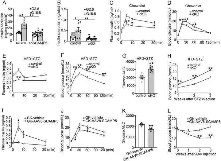 研究数据表明糖尿病状态下,啮齿动物胰腺β细胞中SCAMP5的表达显著降低。为探索SCAMP5减少对胰岛素分泌的影响,研究者一方面构建了SCAMP5敲低的细胞系,评估结果显示SCAMP5敲低会损害葡萄糖刺激的胰岛素分泌。另一方面构建了β细胞特异性Scamp5敲除(cKO)小鼠,体外胰岛及体内整体的GSIS均受损,伴随葡萄糖耐受异常;经高脂饮食+STZ诱导模拟晚期T2D后,其血浆胰岛素水平更低、血糖控制更差。通过AAV8-Insulin1-SCAMP5靶向上调糖尿病GK大鼠胰岛的SCAMP5表达,可显著提升其葡萄糖刺激后的血浆胰岛素水平,改善葡萄糖耐受并降低血糖。